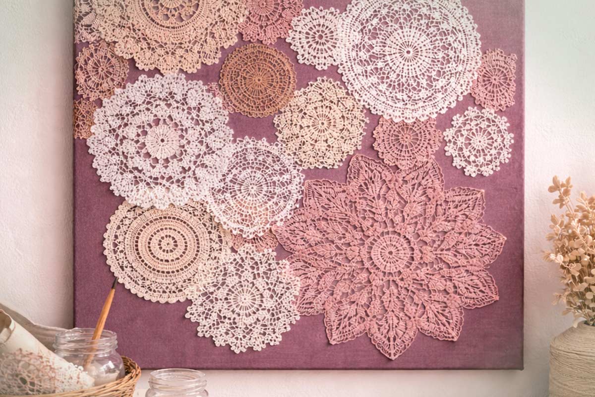 Capita ancora di trovare vecchi centrini in fondo ai cassetti. Invece di lasciarli lì, puoi scegliere quelli con colori simili oppure mixare diverse sfumature. Basta incollarli su una base rigida (anche una vecchia tela va bene) e creare una decorazione materica da parete. È un modo pratico per portare una memoria di famiglia in soggiorno, sopra il letto o all’ingresso. Ogni volta che la luce del mattino li sfiora, cambiano volto: la stanza diventa subito più calda.